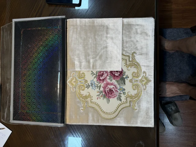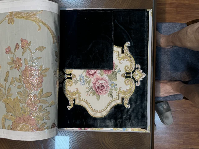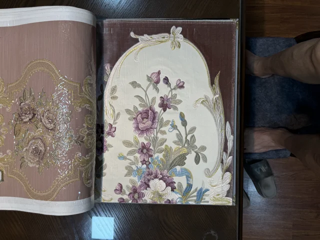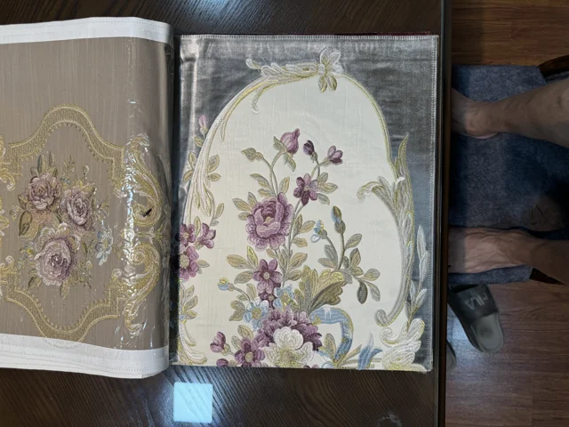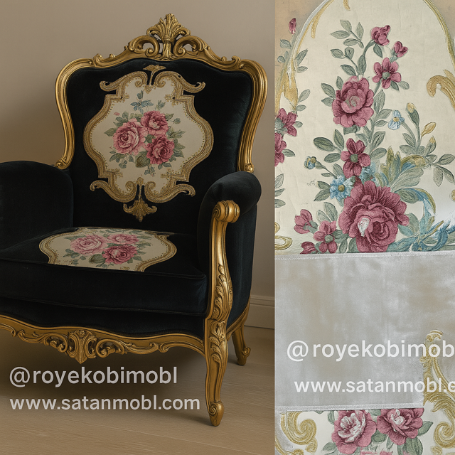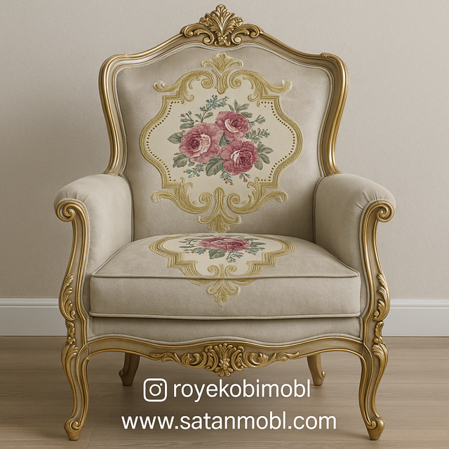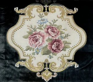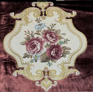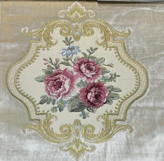 پارچه مبلی استیل و کلاسیک تک گل گلدوزی شده همراه با گل کاناپه ای